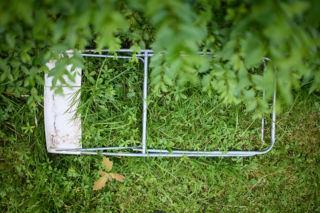 Hilfsgärtner Luca Ricci sorgt für Sauberkeit in der abl-Siedlung Maihof. Er würde sich Aschenbecher wünschen, damit keine Zigarettenstummel auf der Strasse oder im Rasen landen – wie dieser alte Gartenstuhl, der nicht korrekt entsorgt worden ist.