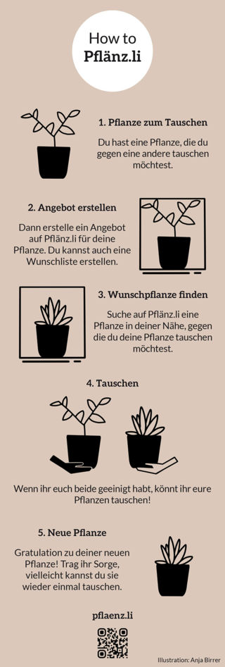Auf der Plattform Pflänz.li haben Menschen die Möglichkeit, ihre Pflanzen und Setzlinge zum Tausch anzubieten und im Gegenzug in einer Wunschliste anzugeben, welche Gewächse sie sich selbst wünschen. Wer also schon immer mal eine Graptopetalum Paraguayense, einen Geldbaum oder eine Monstera wollte, wird auf Pflänz.li fündig. Darüber hinaus können auch Töpfe, Werkzeuge oder anderes Zubehör getauscht werden. «Und falls jemand einfach seine Pflanzen loswerden möchte, können diese auch gegen etwas ganz anderes getauscht werden.»