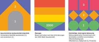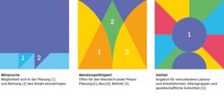 Das Prinzip der Forschungsarbeit war einfach: Die Kooperation führte Anlässe durch, das Team der HSLU beobachtete. Nach jedem Anlass kamen das Team der HSLU und die Mitglieder der Geschäftsstelle der Kooperation Industriestrasse zur Reflexion zusammen. Gemeinsam wurde nachgedacht: Wie haben sich die Teilnehmer und Teilnehmerinnen verhalten? Wie war der Ablauf? Wurden die Inhalte sinnvoll vermittelt? Wer verkörperte welche Rolle? Und wie wurde diese wahrgenommen? Aufgrund der gesammelten Antworten konnte die Kooperation das Vorgehen bei den Workshops laufend verbessern und entwickeln. Was macht die Arealentwicklung der Industriestrasse aus? Im Rahmen der begleitenden Evaluation wurde mit Vertreterinnen und Vertretern der beteiligten Baugenossenschaften an drei Workshops die Vision und das Leitbild der Kooperation konkretisiert. Die neun Punkte, die in der Prozessplanung und in der Umsetzung des Projekts besonders hervorgehoben wurden, sind in den Grafiken dargestellt.