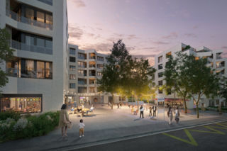 Zum Verweilen einladend begrüsst der neue Quartierplatz die Besuchenden, die mit dem Bus Nr. 12 ankommen: Statt heissen Asphalt bietet ein Mergelbelag die perfekte Lösung zwischen dem Wunsch nach Naturnähe und Begehbarkeit ohne Stolperfallen. Über dem Platz wird ein Blätterdach gewünschten Schatten spenden und auch der Brunnen auf dem Platz bietet im Sommer eine nasse Abkühlung. Vom Gemeinschaftsraum sowie vom Gewerbelokal, die beide direkt am Platz liegen, kann die Fläche nicht nur für Feste und Anlässe mitgenutzt werden. Ein Quartierplatz mit Lebensqualität – Sommer wie Winter!