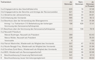 Die ordentlichen statutarischen Geschäfte und weiteren Vorlagen wurden allesamt ohne grössere Diskussionen durchgewinkt, siehe Box mit den Ergebnissen unten. Die Verzinsung des Genossenschaftskapitals und einige Punkte des neuen Vermietungsreglements sorgten für vereinzelte kritische Fragen. Die Stimmberechtigten folgten indessen in allen Punkten den Empfehlungen des Vorstands. Ausserdem wurden Patrick Markmiller, Nicole Renggli-Frey und Dorothea Zünd-Bienz als Vorstandsmitglieder wiedergewählt.