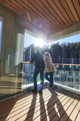 Was für ein Ausblick! Die Erker-Loggias an der oberen Bernstrasse bieten dank der Glasschiebewände auch bei kühleren Temperaturen ein wunderbares «Zusatzzimmer». So lassen sich bis spät in den Herbst oder bereits früh im Frühling draussen die Sonnenstrahlen geniessen.
