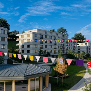 Seit dem Pfingstwochenende verschönern farbige Wimpelketten die Maihofhalde. Auf Initiative von zwei Mieter*innen trafen sich Bastelfreudige aus dem Obermaihof und verwandelten den Pavillon in eine Fähnchen-Werkstatt. Was am Sonntag begann, wurde aufgrund der Euphorie am nächsten Tag gleich weitergeführt. Und das Rattern der Nähmaschinen soll weitergehen: Noch im Sommer soll die nächste Aktion stattfinden!