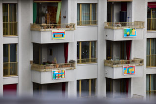 Auf einmal hängen farbige Rechtecke an Balkongeländern. Sorgfältig verschachtelte, aufgereihte, ineinandergreifende geometrische Formen in satten Farben: Grün, Rot, Orange, Gelb, Blau. Sind das Farbmuster? Fahnen für eine Kampagne? Doch für welche? Oder vielmehr eine Flagge für ein noch unbekanntes Land? Haben die Banner eine Funktion? Einen Zweck? Oder sind sie einfach Dekoration?
