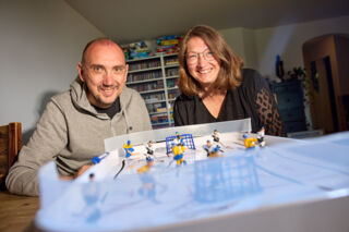 Dass die Familie Naujokat ihr Zuhause geniesst, ist auch im Wohnzimmer leicht erkennbar. Gegenüber dem Sofa fällt der Blick auf ein grosses Aquarium mit Korallen und bunten Fischen. «Ja, wir sitzen oft auf dem Sofa und beobachten das Farbenspiel der Korallen und natürlich die Fische; wie sie sich bewegen, sich im Sand zum Schlafen einbuddeln, sich annähern und wieder verscheucht werden. Sie haben alle ein Eigenleben und spannende Interaktionen.» Ebenfalls auffällig ist das wandfüllende Bücherregal, gefüllt mit Musik-CDs und unzähligen bunten Schachteln mit Spielen für jedes Alter. Tobias schmunzelt: «Die CDs sind eher Nostalgie. Natürlich nutzen wir Spotify und hören damit alles; von unseren Jugendhits bis zu aktuellen Songs.» Die Spiele hingegen sind Karolins Leidenschaft, die sie mit ihrem Sohn Tim und gerne auch mit seinen Freunden teilt. Eines der ersten Spiele haben Tobias und Karolin vor vielen Jahren jedoch für sich gekauft: ein Tisch-Eishockey. Etwas verbogen und verbeult ist ihm anzusehen, dass sie oft und leidenschaftlich damit gespielt haben. Und beide nehmen mit einem Lachen je für sich in Anspruch, immer zu gewinnen.