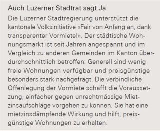 Das Formular auszufüllen, dauert weniger als zwei Minuten. Zudem käme die sogenannte Formularpflicht in Luzern nur, wenn die Leerwohnungsziffer (die den Anteil leerstehender Wohnungen am Gesamtwohnungsbestand misst) unter 1.5 Prozent liegt. Dies wäre mitunter in der Stadt Luzern der Fall, dort liegt die Leerwohnungsziffer aktuell bei 1.16 Prozent. Die zusätzliche Transparenz wird also nur in Regionen eingeführt, in denen Wohnungsnot herrscht und der Druck auf dem Wohnungsmarkt am grössten ist. So bleibt der Aufwand gering und die Wirkung wird dort erzielt, wo sie am meisten bringt.