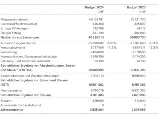 Das Budget 2024 bewegt sich im Rahmen der Zahlen aus dem Vorjahr. Es zeigt wiederum eine solide und aktive abl. Die neuen genossenschaftlichen Wohnungen zahlen sich aus und die Investitionen in die Nachhaltigkeit tragen langsam Früchte.