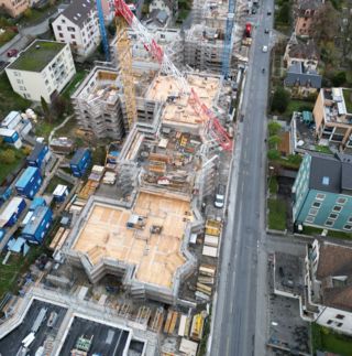 Es ist eng auf der Baustelle in der oberen Bernstrasse, jeder Quadratmeter ist genau verplant, Zu- und Wegfahrten müssen exakt koordiniert werden. Aber das ist kein Problem für die erfahrenen Bauarbeiterinnen und Bauarbeiter. Es geht voran: Die ersten Dächer sind betoniert und erste Fenster bereits drin. Wer sich fürs Leben ab Mitte 2024 in der oberen Bernstrasse interessiert, kann sich unter bernstrasse.ch für den Newsletter anmelden.