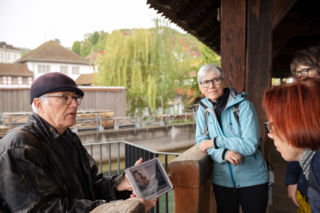 Vom Regen unbeirrt führte Hansruedi Hitz die Expedition u.a. zur Spreuerbrücke, dem Reussinsel-Uferweg entlang zur Viscosistadt und der Kleinen Emme mit hohem Wasserstand folgend zur Emmenweid, wo sich zum Abschluss die Sonne zeigte.
