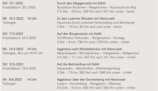 Ob vorbei an Luzerns Wandmalereien, durchs Gehölz im Meggerwald oder aufwärtsRichtung Bürgenstock – das Wanderprogramm fürs erste Halbjahr 2022 ist abwechslungsreich und vielversprechend.