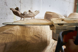 Es könnte ein Wal sein, ein Kamel oder auch ein Fischreiher: Das Eichenholz aus dem Jura nimmt langsam Formen an, entfaltet sein Gesicht und seine Gestalt im Auge des Betrachters oder der Betrachterin.