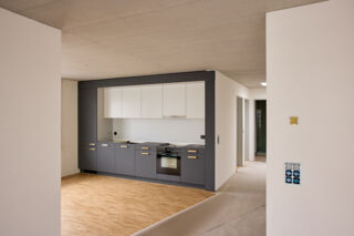 Die Farbe «Salbei» bleibt und wird mit türkisfarbenen Plättli im Badezimmer ergänzt. In den Küchen prägen nun Grautöne und Anthrazit den Raum. In allen Räumen schmückt lasierter Sichtbeton die Decken, die Sonnenstunden geniesst man von der Loggia, die vom offenen Wohn- und Küchenbereich zugänglich ist. Mehr Platz im Freien bietet zudem das Pärkli mit Gemeinschaftsraum vor der Haustür.