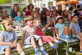 Die Jubiläumsaktivitäten der abl sind eine gute Gelegenheit, neue Quartiere zu entdecken. So etwa am 7. September den rundum erneuerten Obermaihof, wo unter freiem Himmel ein Kinderkonzert und eine Puppengeschichte auf dem Programm standen. Bevor es losging, lud an diesem sommerlichen Samstagnachmittag eine Sirupbar im neuen Pavillon mitten in der Siedlung zu einer Erfrischung. Dazu gabs Apfelschnitze, Guetsli und für die Erwachsenen altersgerechte Getränke.